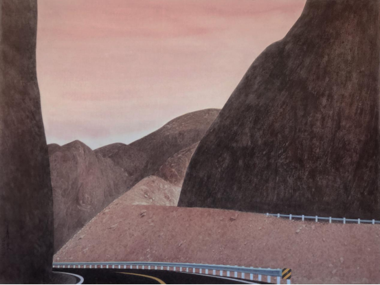 《路路相连》系列作品是近几年饶秀光以交通“公路”为主题,以体现人与自然和谐共生、自然环境与人文环境有机结合为方向的艺术创作。获奖作品《路路相连之十八》描绘了穿行在童山秃岭的公路,采用了现实主义的视角、写实的手法及发射式的构图,以高级红灰色作为画面的主色调,公路护栏又采用蓝色和白色,增强了作品的主题性、艺术性及现代感,展现了交通对经济发展、社会进步、生态保护、国防安全的重要性,并强调其对农民脱贫和乡村振兴的意义。