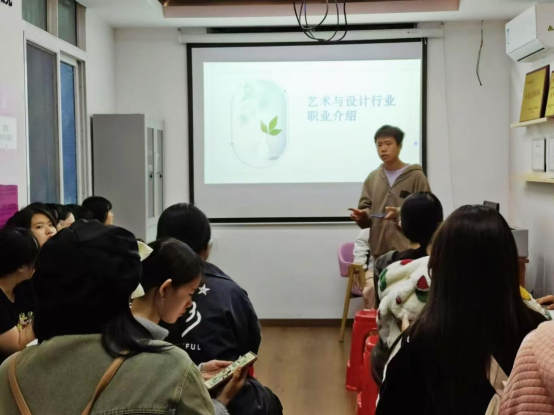 艺术公司员工的就业方向整体分为教育类、艺术创作类、设计类、影视与动画类。其中,音乐学专业职业分为音乐老师、音乐创作,舞蹈表演专业职业有舞蹈演员、舞蹈编导、舞蹈老师。会上,主讲人依次介绍了各项职业,用精炼概括的语言总结归纳,让同学们对自己的未来职业有了更清晰的定位。