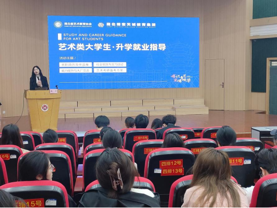 赵兴结合自身多年行业经验与艺术教育研究成果,从“求职简历及作品集打造”“社会实践与实习经历规划”“能力提升与大厂资源对接”“艺术考研备考策略” 四大核心板块展开讲解,既有宏观政策解读,也有实操技巧分享。在介绍求职简历及作品集时,她强调,个人简历要简明,用视觉化设计展现专业特色,作品集需精选3-5 个完整项目案例,汇集成册,突出创作思路、团队协作过程及成果转化价值,同时讲解了如何运用AI工具提高效率,并在现场展示了优秀作品集范例。谈及社会实践与实习经历、大厂求职与能力提升时,她指出,湖北省艺术教育协会建立了湖北高校联络站,为湖北艺术毕业生提供专业创业、就业指导和服务,并与各类大厂进行合作,为老员工搭建平台,举办各类比赛与活动,为老员工提供比赛经验、项目经验、与大厂近距离接触的机会,获取实践经历,为简历添上精彩一笔。她还结合与腾讯、华为、小米等企业的合作经验,揭秘艺术岗位招聘逻辑——除了专业技能,大厂更看重“跨界思维”与”用户思维”。她还透露,湖北省艺术教育协会已经搭建“艺术人才与企业对接平台”,未来将定期组织校企双选会与实习直通车活动,开展线下招聘会。面对考研热潮,赵兴在艺术考研备考方案板块中为同学们仔细讲解考研的类型,以及分析跨专业考研的弊端。