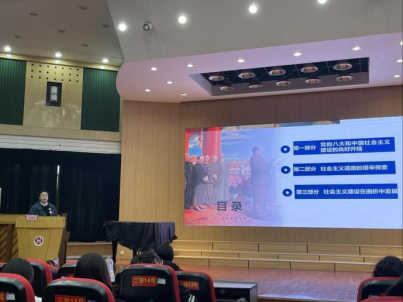 党总支副书记胡增裕党课的主题是“坚持和发展中国特色社会主义的总任务”。为进一步提高积极分子对党的认识,胡书记带领学员们重温党史,就百年大党为什么会越来越好做细致入微的讲解,引导全体学员为实现中华民族伟大复兴贡献自己的一份青春力量。
